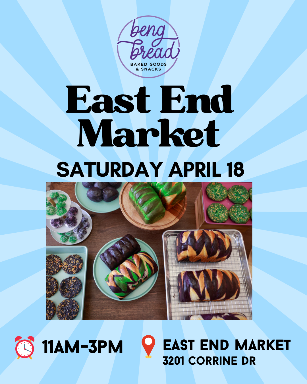 Indulge in Delicious and Unique Baked Goods from Orlando Order Now! Date *Thursday, March 26, 2026 *Porch Pick Up in Winter Garden, After 5pm (Hamlin/Summerlake Area - Near Horizon West Orlando Health Hospital)DO NOT REMOVEFriday, March 27, 2026 *Porch Pick Up in Winter Garden, After 5pm (Hamlin/Summerlake Area - Near Horizon West Orlando Health Hospital)Saturday, March 28, 2026 *Delivery to Greater Orlando! Minimum order $25Porch Pick Up in Winter Garden (Hamlin/Summerlake Area - Near Horizon West Orlando Health Hospital)Friday, April 3, 2026 *PRIVATE EVENT: Sunday CoolFriday, April 10, 2026 *Porch Pick Up in Winter Garden, After 5pm (Hamlin/Summerlake Area - Near Horizon West Orlando Health Hospital)Saturday, April 11, 2026 *Delivery to Greater Orlando! Minimum order $25Porch Pick Up in Winter Garden (Hamlin/Summerlake Area - Near Horizon West Orlando Health Hospital)Friday, April 17, 2026 *Porch Pick Up in Winter Garden, After 5pm (Hamlin/Summerlake Area - Near Horizon West Orlando Health Hospital)Saturday, April 18, 2026 *POP UP! East End Market from 11am-3pm (3201 Corrine Dr)Tuesday, April 21, 2026 *PRIVATE EVENT: Sunday CoolFriday, May 1, 2026 *Porch Pick Up in Winter Garden, After 5pm (Hamlin/Summerlake Area - Near Horizon West Orlando Health Hospital)Saturday, May 2, 2026 *Delivery to Greater Orlando! Minimum order $25Porch Pick Up in Winter Garden (Hamlin/Summerlake Area - Near Horizon West Orlando Health Hospital)Friday, May 8, 2026 *Porch Pick Up in Winter Garden, After 5pm (Hamlin/Summerlake Area - Near Horizon West Orlando Health Hospital)Saturday, May 9, 2026 *Delivery to Greater Orlando! Minimum order $25Porch Pick Up in Winter Garden (Hamlin/Summerlake Area - Near Horizon West Orlando Health Hospital)Friday, May 15, 2026 *Porch Pick Up in Winter Garden, After 5pm (Hamlin/Summerlake Area - Near Horizon West Orlando Health Hospital)Saturday, May 16, 2026 *POP UP! East End Market from 11am-3pm (3201 Corrine Dr)Tuesday, June 9, 2026 *PRIVATE EVENT: Sunday CoolFriday, June 12, 2026 *Porch Pick Up in Winter Garden, After 5pm (Hamlin/Summerlake Area - Near Horizon West Orlando Health Hospital)Saturday, June 13, 2026 *Delivery to Greater Orlando! Minimum order $25Porch Pick Up in Winter Garden (Hamlin/Summerlake Area - Near Horizon West Orlando Health Hospital)Saturday, June 20, 2026 *POP UP! Night Market - Details TBA!Friday, June 26, 2026 *PRIVATE EVENT: Sunday CoolRegular MenuUbe SiopaoNEW ITEM: UBE SIOPAO ($4) Light, Fluffy Ube Siopao (Bao) with a salted duck egg yolk custard + ube halaya (jam) filling!QuantitySunday Cool : Pork SiopaoSUNDAY COOL ONLY: PORK SIOPAO ($5)QuantityOoey Gooey Bar - Available during select datesOoey Gooey Bar ($3.50/Bar) - A Filipino take on a southern classic decadent treat. A pandan cookie layer topped with an ube cream cheese layer. (Available during select dates) BengBread Bundle 3 for $10QuantityFurikake Rice Krispie Treats!Furikake Rice Krispie Treats ($3.50/Bar) - Furikake Chex Mix + Rice Krispie Cereal = A match made in Marshmallow, White Chocolate, Furikake heaven. (Available during select dates) BengBread Bundle 3 for $10QuantityBanana Bread - Available during select datesUbe and Pandan Banana Bread ($3.50/Bar) - Filipino-inspired with dates, walnuts, coconut flakes & white chocolate. (Available during select dates) BengBread Bundle 3 for $10QuantityCOOKIESThe Royal Ube Cookie (Oatmeal, Coconut, Cornflakes) (1 for $3.50 or 3 for $10.00) If texture is your thing, this cookie has it! An oatmeal cookie with cornflakes, coconut, and white chocolate. Topped with Flaky Sea Salt. BengBread Bundle 3 for $10QuantityThe Royal PandanThe Royal Pandan Cookie (Oatmeal, Coconut, Cornflakes) (1 for $3.50 or 3 for $10.00) If texture is your thing, this cookie has it! An oatmeal cookie with cornflakes, coconut, and white chocolate. Topped with Flaky Sea Salt. BengBread Bundle 3 for $10QuantityHalo Halo CookieHalo Halo Cookie ($5.00) An Ube, Pandan, and Mango Sugar Cookie mixed together with a Yema Filling. *Halo Halo = Mix Mix *Yema = A Sweet Custard-like filling, similar to a dulce de leche.QuantityS'more CookieUbe S'mores Anniversary Cookie ($7.00) Created to celebrate my 2nd anniversary, an Ube cookie stuffed and topped w/ Ube Marshmallows, sitting atop two Biscoff cookies.QuantityUbe Crinkle CookiesUbe Crinkle Cookies: 5 Pack ($7.50) Unable to Ship. The most popular cookie! A soft, moist cookie, jam-packed with Ube flavor.QuantityGF Ube Crinkle CookiesGLUTEN FREE Ube Crinkle Cookies: 5 Pack ($7.50) Unable to Ship - The most popular cookie! A soft, moist cookie, jam-packed with Ube flavor.QuantityPandan Crinkle CookiesPandan Crinkle Cookies, 5 Pack ($7.50) Unable to Ship. The most popular cookie! A soft, moist cookie, jam-packed with Pandan flavor.QuantityBREADUbe Swirl Loaf : Ube + White Wheat - Large ($11.00) Fluffy Ube Milk Bread swirled with White Wheat. (FREE Ube Butter in small glass jar included)QuantityAll Ube LoafAll Ube Loaf - Large ($13.00) Fluffy Ube Milk Bread. (FREE Ube Butter in small glass jar included)QuantityPandan Swirl LoafPandan Swirl Loaf : Pandan + White Wheat - Large ($11.00) Fluffy Pandan Milk Bread swirled with White Wheat. (FREE Ube Butter in small glass jar included)QuantityAll Pandan LoafAll Pandan Loaf - Large ($13.00) Fluffy Pandan Milk Bread. (FREE Ube Butter in small glass jar included)QuantityCHEX MIXFURIKAKE CHEX MIX ($5.00) Sweet + Salty snack mix of Chex, Honeycomb and Bugles, with a garlic peanut spin.QuantityUbe Chex MixUBE CHEX MIX ($6) Ube Coated Chex, Honeycomb, Cinnamon Bunny Grahams, TJ's Mochi Stars, Cassava Chips, White Chocolate, Mini Ube CookiesQuantityPandan Chex MixPANDAN CHEX MIX ($6) Pandan Coated Chex, Honeycomb, Cinnamon Bunny Grahams, TJ's Mochi Stars, Coconut Shreds, White Chocolate, Mini Pandan CookiesQuantityGarlic PeanutsGarlic Peanuts ($6.50) Red-skinned peanuts, garlic salt, and garlic chips. Pair with your favorite drink and company.QuantityUBE MUFFINSUbe Muffin: Cheese + Jam, 6 Pack ($8.50) 6