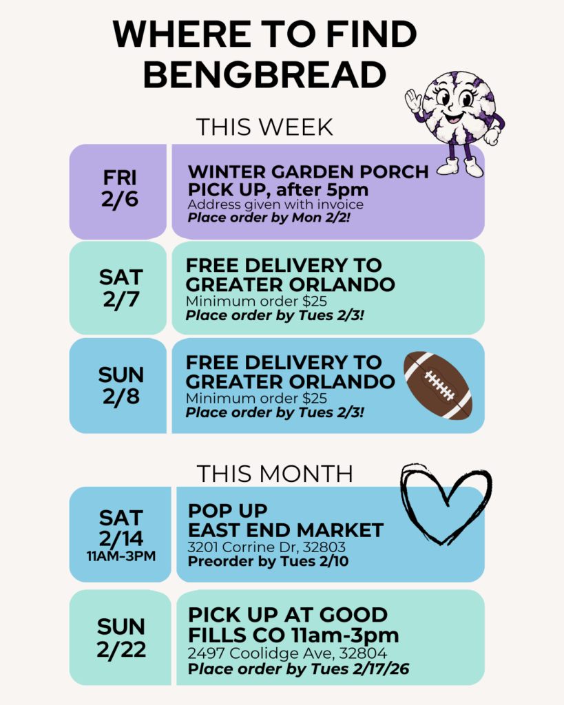 Indulge in Delicious and Unique Baked Goods from Orlando Order Now! Date *Friday, Jan 30, 2026 *SUNDAY COOL PRE-ORDER ONLY!Saturday, January 31, 2026 *Delivery to Greater Orlando!Porch Pick Up in Winter Garden (Hamlin/Summerlake Area - Near Horizon West Orlando Health Hospital)Friday, Feb 6, 2026 *Porch Pick Up in Winter Garden, After 5pm (Hamlin/Summerlake Area - Near Horizon West Orlando Health Hospital)Saturday, February 7, 2026 *Delivery to Greater Orlando! Minimum order $25Porch Pick Up in Winter Garden (Hamlin/Summerlake Area - Near Horizon West Orlando Health Hospital)Sunday, February 8, 2026 *Delivery to Greater Orlando! Minimum order $25Porch Pick Up in Winter Garden (Hamlin/Summerlake Area - Near Horizon West Orlando Health Hospital)Friday, Feb 13, 2026 *Porch Pick Up in Winter Garden, After 5pm (Hamlin/Summerlake Area - Near Horizon West Orlando Health Hospital)Saturday, February 14, 2026 *POP UP! East End Market 11am-3pm (3201 Corrine Drive)Sunday, February 15, 2026 *Porch Pick Up in Winter Garden (Hamlin/Summerlake Area - Near Horizon West Orlando Health Hospital)Friday, Feb 20, 2026 *Porch Pick Up in Winter Garden, After 5pm (Hamlin/Summerlake Area - Near Horizon West Orlando Health Hospital)Saturday, February 21, 2026 *Delivery to Greater Orlando! Minimum order $25Porch Pick Up in Winter Garden (Hamlin/Summerlake Area - Near Horizon West Orlando Health Hospital)Sunday, February 22, 2026 *Pick Up at Good Fills Co!Porch Pick Up in Winter Garden (Hamlin/Summerlake Area - Near Horizon West Orlando Health Hospital)Friday, March 6, 2026 *Porch Pick Up in Winter Garden, After 5pm (Hamlin/Summerlake Area - Near Horizon West Orlando Health Hospital)Saturday, March 7, 2026 *Delivery to Greater Orlando! Minimum order $25Porch Pick Up in Winter Garden (Hamlin/Summerlake Area - Near Horizon West Orlando Health Hospital)Sunday, March 8, 2026 *Pick Up at Good Fills Co!Porch Pick Up in Winter Garden (Hamlin/Summerlake Area - Near Horizon West Orlando Health Hospital)Friday, March 13, 2026 *Porch Pick Up in Winter Garden, After 5pm (Hamlin/Summerlake Area - Near Horizon West Orlando Health Hospital)Saturday, March 21, 2026 *Delivery to Greater Orlando! Minimum order $25Porch Pick Up in Winter Garden (Hamlin/Summerlake Area - Near Horizon West Orlando Health Hospital)Sunday, March 15, 2026 *Pick Up at Good Fills Co!Porch Pick Up in Winter Garden (Hamlin/Summerlake Area - Near Horizon West Orlando Health Hospital)Saturday, March 14, 2026 *POP UP! East End Market from 11am-3pm (3201 Corrine Dr)Sunday, March 22, 2026 *Pick Up at Good Fills Co!Porch Pick Up in Winter Garden (Hamlin/Summerlake Area - Near Horizon West Orlando Health Hospital)Regular MenuBengBread Bundle 3 for $10 - Mix and Match 3 of the following (Royal Ube or Pandan, Ooey Gooey Bar, and Banana Bread) Valued at $10.50QuantityNEW ITEM: UBE SIOPAO ($4) Light, Fluffy Ube Siopao (Bao) with a salted duck egg yolk custard + ube halaya (jam) filling!QuantityOoey Gooey Bar ($3.50/Bar) - A Filipino take on a southern classic decadent treat. A pandan cookie layer topped with an ube cream cheese layer. (Available during Pop-Up Market Weekends!) BengBread Bundle 3 for $10QuantityUBE CHEX MIX ($6) Ube Coated Chex, Honeycomb, Cinnamon Bunny Grahams, TJ's Mochi Stars, Cassava Chips, White Chocolate, Mini Ube CookiesQuantityPANDAN CHEX MIX ($6) Pandan Coated Chex, Honeycomb, Cinnamon Bunny Grahams, TJ's Mochi Stars, Coconut Shreds, White Chocolate, Mini Pandan CookiesQuantityFURIKAKE CHEX MIX ($5.00) Sweet + Salty snack mix of Chex, Honeycomb and Bugles, with a garlic peanut spin.QuantityCHEX MIX TRIO ($15) Ube, Pandan, and Furikake 6 oz bags (Valued at $17) PRE-ORDER PRICE ONLY!QuantityGarlic Peanuts ($6.50) Red-skinned peanuts, garlic salt, and garlic chips. Pair with your favorite drink and company.QuantityRegular S'more CookieUbe S'mores Anniversary Cookie ($7.00) Created to celebrate my 2nd anniversary, an Ube cookie stuffed and topped w/ Ube Marshmallows, sitting atop two Biscoff cookies.QuantityRegular Halo Halo CookieHalo Halo Cookie ($5.00) An Ube, Pandan, and Mango Sugar Cookie mixed together with a Yema Filling. *Halo Halo = Mix Mix *Yema = A Sweet Custard-like filling, similar to a dulce de leche.QuantityUbe Crinkle Cookies: 5 Pack ($7.50) Unable to Ship. The most popular cookie! A soft, moist cookie, jam-packed with Ube flavor.QuantityGLUTEN FREE Ube Crinkle Cookies: 5 Pack ($7.50) Unable to Ship - The most popular cookie! A soft, moist cookie, jam-packed with Ube flavor.QuantityPandan Crinkle Cookies, 5 Pack ($7.50) Unable to Ship. The most popular cookie! A soft, moist cookie, jam-packed with Pandan flavor.QuantityUbe Swirl Loaf : Ube + White Wheat - Large ($11.00) Fluffy Ube Milk Bread swirled with White Wheat. (FREE Ube Butter in small glass jar included)QuantityAll Ube Loaf - Large ($13.00) Fluffy Ube Milk Bread. (FREE Ube Butter in small glass jar included)QuantityPandan Swirl Loaf : Pandan + White Wheat - Large ($11.00) Fluffy Pandan Milk Bread swirled with White Wheat. (FREE Ube Butter in small glass jar included)QuantityAll Pandan Loaf - Large ($13.00) Fluffy Pandan Milk Bread. (FREE Ube Butter in small glass jar included)QuantityUbe Muffin: Cheese + Jam, 6 Pack ($8.50) 6 Ube Muffins filled with Cheese with Ube Jam (Halaya). (FREE Ube Butter in small plastic jar included)QuantityUbe Muffin: Macapuno + Jam, 6 Pack ($8.50) 6 Ube Muffins filled with Macapuno (young coconut strips) with Ube Jam (Halaya) (FREE Ube Butter in small plastic jar included)QuantityUbe Muffin: Jam, 6 Pack ($8.50) 6 Ube Muffins filled with Ube Jam (Halaya) (FREE Ube Butter in small plastic jar included)QuantityThe Royal Ube Cookie (Oatmeal, Coconut, Cornflakes) (1 for $3.50 or 3 for $10.00) If texture is your thing, this cookie has it! An oatmeal cookie with cornflakes, coconut, and white chocolate. Topped with Flaky Sea Salt. BengBread Bundle 3 for $10QuantityThe Royal Pandan Cookie (Oatmeal, Coconut, Cornflakes) (1 for $3.50 or 3 for $10.00) If text